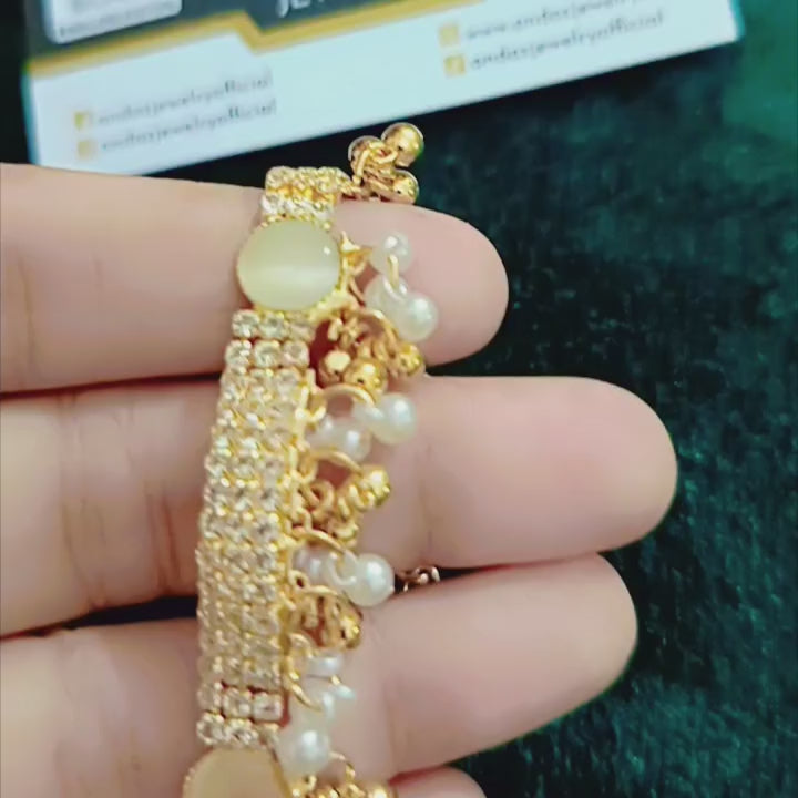 Gajra bracelet in gold and white embedded with beads , latkan pearls and intricate with golden zirconia which gives you timeless elegance .